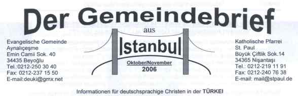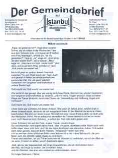 Der Istanbuler Gemeindebrief wird von der Evangelischen Deutschen Gemeinde Istanbul zusammen mit der Katholischen Gemeinde Sankt Paul herausgegeben. Weiterhin erscheinen Gemeindebriefe in Izmir und Ankara, wobei der Gemeindebrief aus Istanbul auch für alle in der Türkei zerstreut lebenden Christen zustaendig ist. |